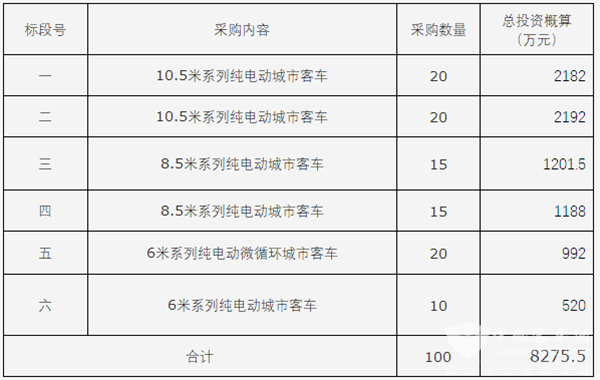 2.1本次公交车采购共计100辆,项目总概算:8275.5万元。
