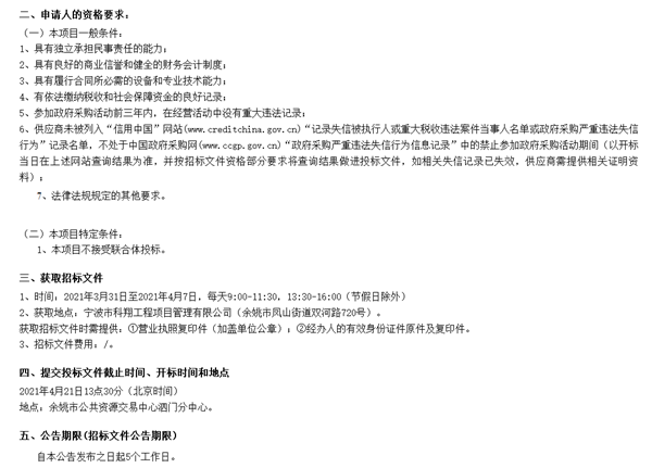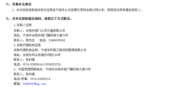 余姚市泗门公共交通有限公司公交车采购项目的潜在投标人应在宁波市科翔工程项目管理有限公司(余姚市凤山街道双河路720号)获取招标文件,并于2021年4月21日 13点 30分(北京时间)前递交投标文件。