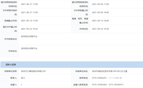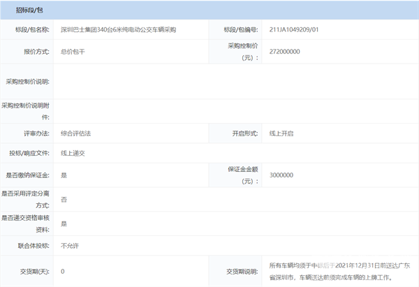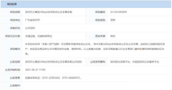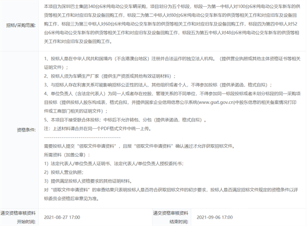 深圳巴士集团340台6米纯电动公交车辆采购公开招标