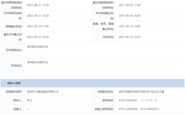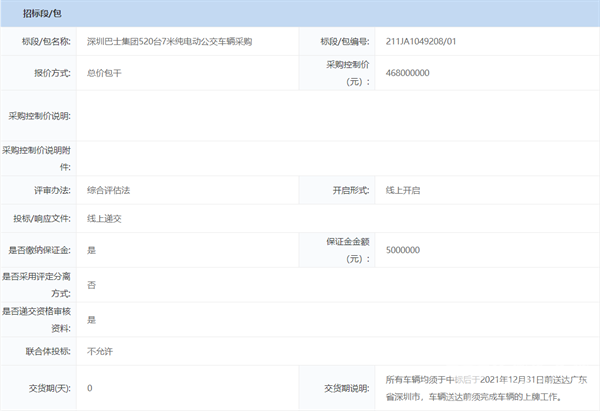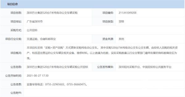 深圳巴士集团520台7米纯电动公交车辆采购公开招标