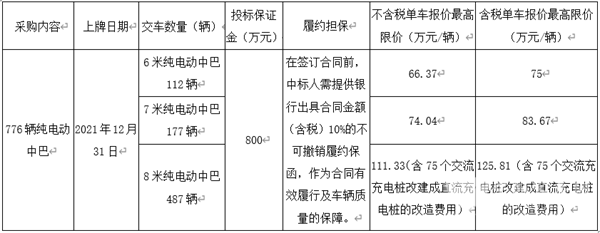 1、本批新能源车辆设一个标的,采用一次报价方式,以“综合得分高者中标”的原则,选定三家中标人。其中第一中标人中标车辆为487辆8米纯电动中巴和57辆7米纯电动中巴,第二中标人中标车辆为120辆7米纯电动中巴,第三中标人中标车辆为112辆6米纯电动中巴。投标人必须同时对776辆新能源车辆进行投标,只对部分车辆投标的将不被接受。