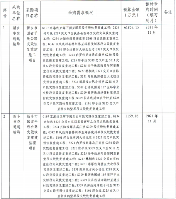 为便于供应商及时了解政府采购信息,根据《河南省财政厅关于开展政府采购意向公开工作的通知》(豫财购【2020】8号)等有关规定,现将新乡市交通运输局 2021年11(至)11月采购意向公开如下: