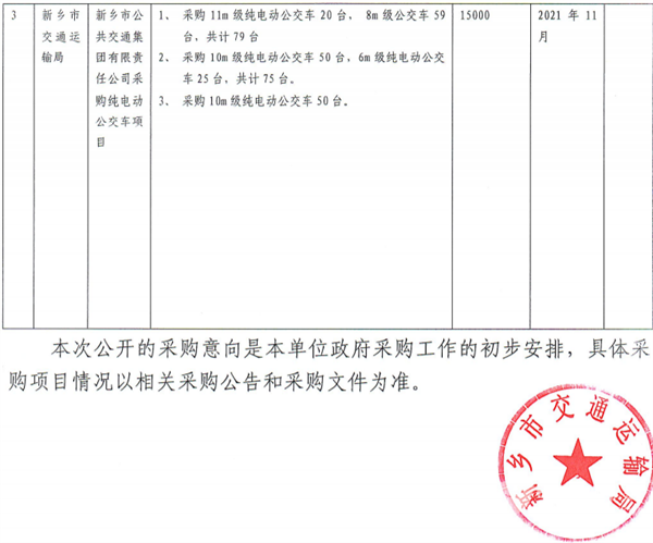 河南新乡市交通运输局灾毁恢复重建、纯电动公交车采购项目意向公开