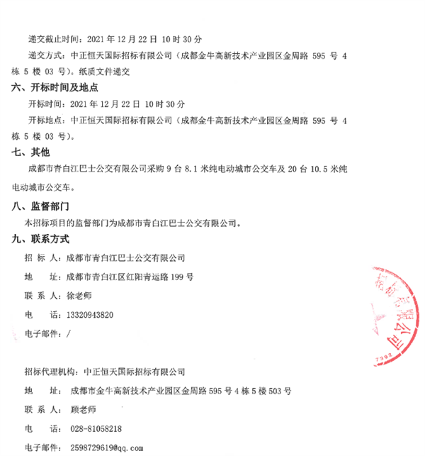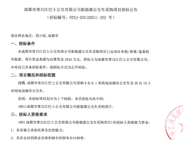 成都市青白江巴士公交有限公司新能源公交车采购项目招标公告