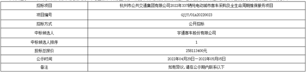 2022年4月29日,杭州公交集团发布了2022年337辆纯电动城市客车采购及全生命周期维保服务项目中标候选人公示,经评标委员会评定,宇通客车股份有限公司以258113400元的投标总报价中标此项目。