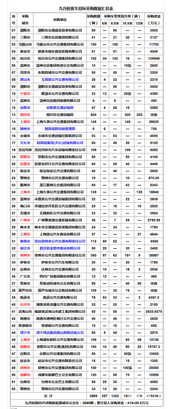 九月份国内共采购新能源城市公交车共计3885辆,累计投入采购资金达419896.5万元。