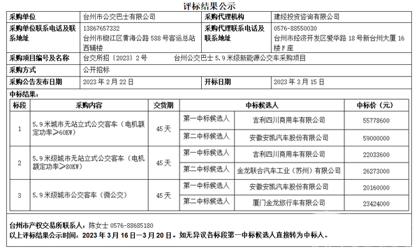 台州公交巴士5.9米级新能源公交车采购项目评标结果公示