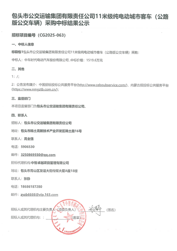 包头市公交集团11米级纯电动城市客车(公路版公交车辆)中标结果公示