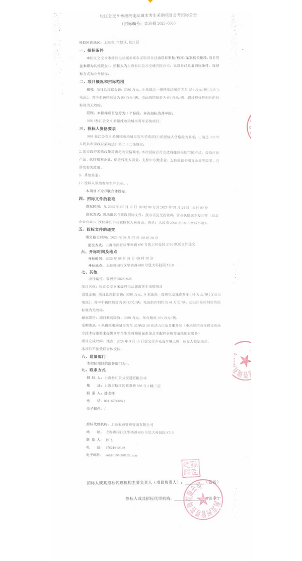 上海松江公共交通有限公司系列公交客车采购招标公告