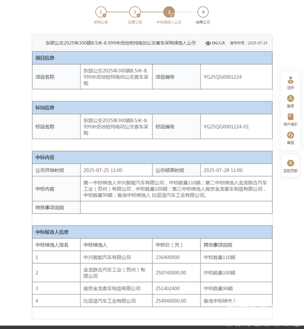 东部公交2025年300辆8.5米-8.999米公交客车采购候选人公示