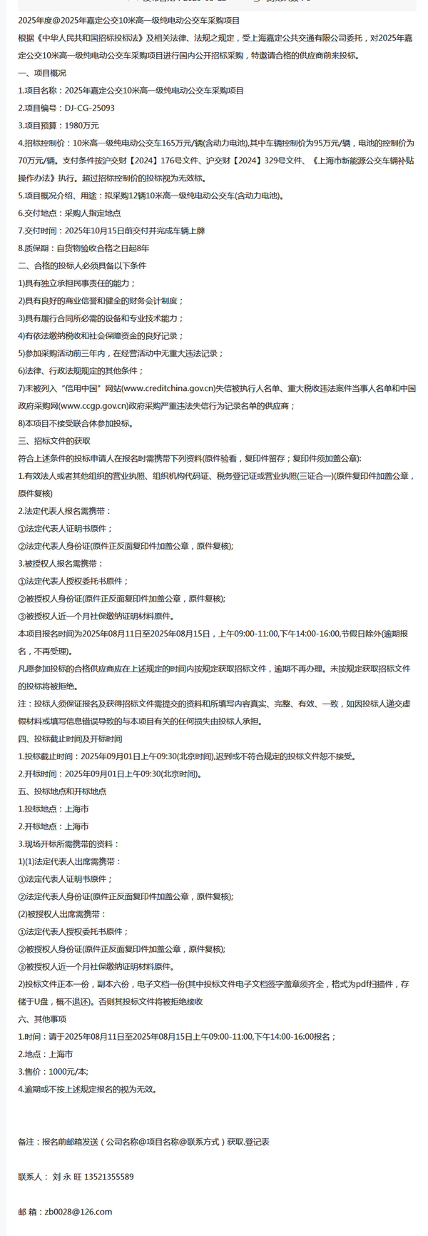 2025年嘉定公交10米高一级纯电动公交车采购项目招标公告