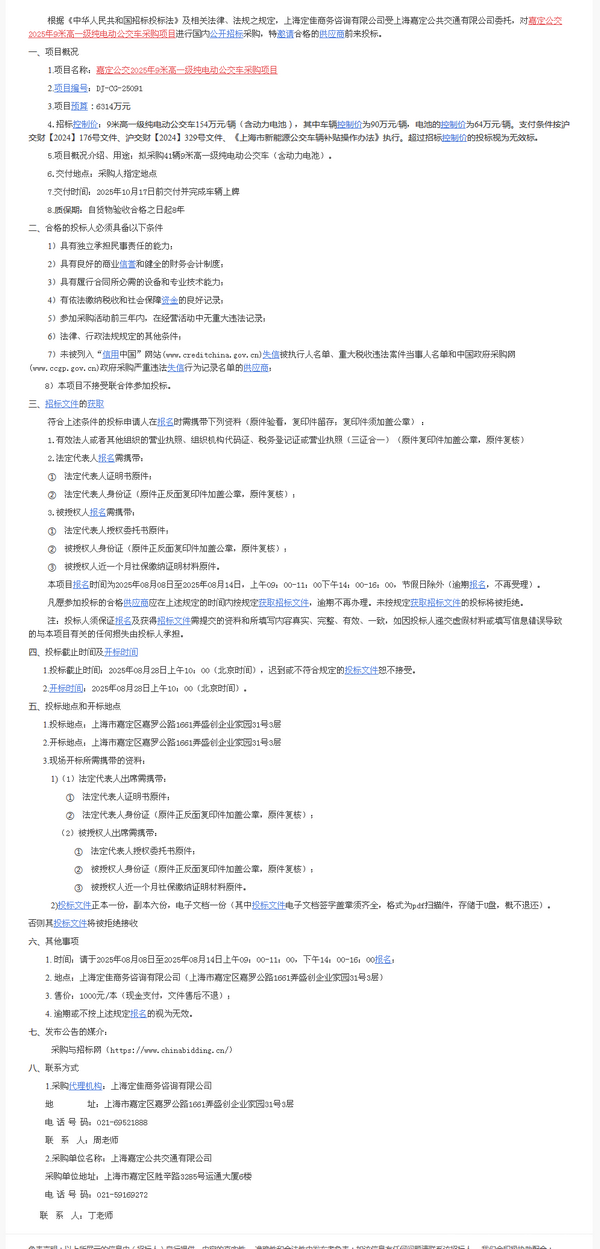 嘉定公交2025年9米高一级纯电动公交车采购项目
