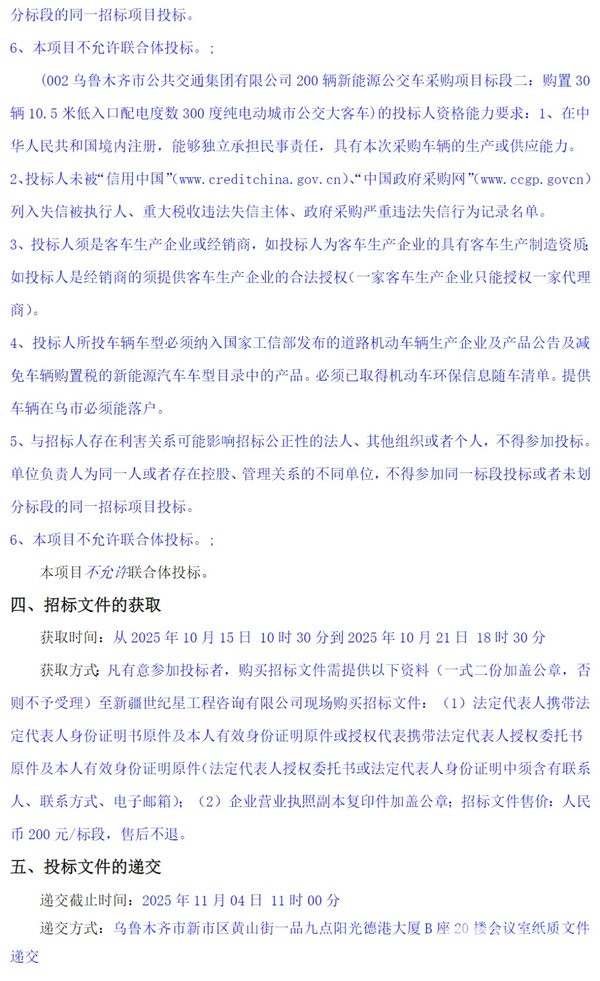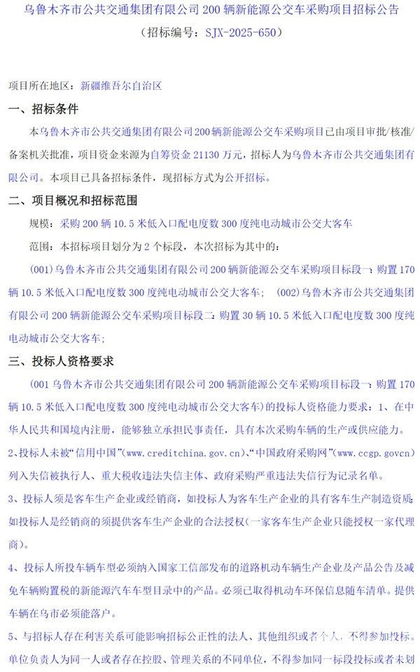 - 新疆乌鲁木齐市公共交通集团有限公司200辆新能源公交车采购项目招标公告