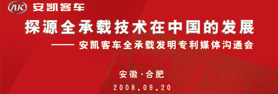 2008年的金秋时节,安凯客车在合肥举行了“探源全承载在中国的发展”——安凯客车全承载发明专利媒体沟通会。安凯客车高层首次就获得全承载发明专利一事与媒体见面……