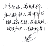 玉鼠回宫传捷报,金牛奋地涌春潮。在这辞旧迎新的美好时刻,我谨代表中国青年汽车集团,向长期关心支持青年汽车发展的各级领导、向社会各界朋友,致以新春的祝福和节日的问候,祝大家新年快乐,万事如意!