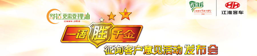 的核心价值,在今后的发展中—如既往地为客户制造“好省油”的产品,降低客户的运营成本,体现江淮客车使用的经济性; C (Comfort舒适性)舒适: “江淮客车更舒适”是企业立足客户的客户提出的更高的人性化追求。“更”体现企业发展在立足基本价值上的进步,也体现在舒适性上的无止境追求; M (Modern现代化的)更现代: 企业在产品情感诉求上追求的是一种精致、优雅的气质,也是企业对产品属性的一种超越时尚、豪华之外的一种“更现代”内涵的追求。