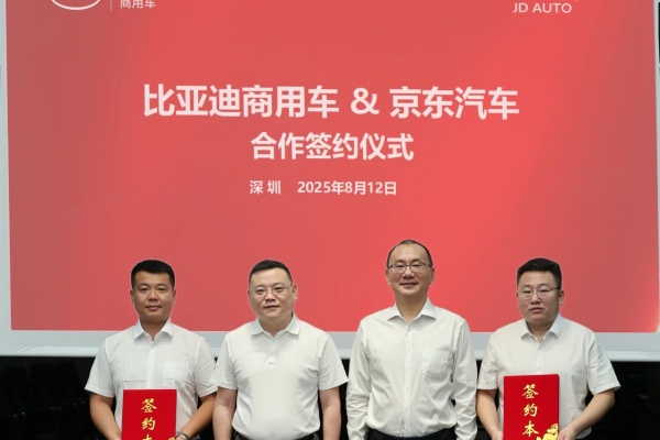 2025年8月12日,比亚迪商用车与京东汽车在深圳坪山总部正式签署战略合作协议。比亚迪商用车事业部总经理田春龙、京东集团高级副总裁王培暖共同见证。