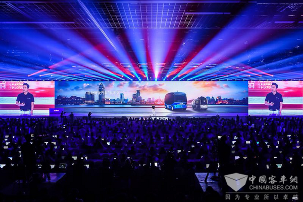 10点整,李彦宏在演讲台上视频连线处在中国南端的厦门金龙客车阿波龙生产线现场,与站在总装生产线的金龙客车董事长谢思瑜在线对话,南北共举全球首辆L4级量产自动驾驶巴士金龙阿波龙下线仪式。