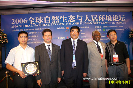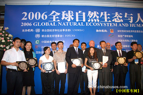2006年7月30日,全球自然生态与人居环境论坛在深圳隆重召开,全球各界环保人士及相关组织汇聚一堂,共同探讨了城乡发展所面临的环境问题及其可持续解决方案。会上,我国著名客车品牌中通客车被指定为"大会接待专用车",同时凭借其对多年来对"绿色交通"作出的贡献,荣膺"全球节能产品奖"。