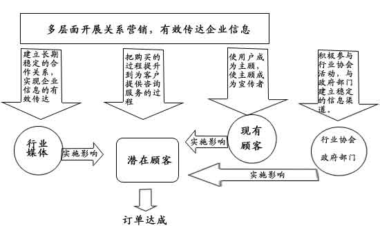 关系营销中有两个重要概念,即推荐渠道和影响因素市场。在工业产品的营销中,广告只能起到公布的作用:告诉顾客我们有什么样的产品;而顾客产品的选择更主要的是靠推荐渠道。一般来说,客运市场内的用户数量不多,彼此比较熟悉,因此口头传播的力量在行业市场中十分重要,企业的广告宣传只有与推荐渠道所传达的信息一致之后才会起作用。推荐渠道一般主要指两个方面:一是用户之间的相互推荐;二是影响因素市场的作用。用户市场和影响因素市场组成了营销中的产业基础,"产业基础" 指对产品和企业有发言权、能够施加影响的组织和个人,包括使用产品的用户,掌握行业信息传递的行业协会、相关的政府官员、相关媒体、业内专家和权威人士等等。